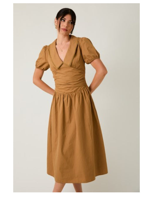 Side zipper, fully lined, Peter Pan collar, 100% cotton, stretch at waist and back, gathered waist line , slight puff sleeve , midi length.