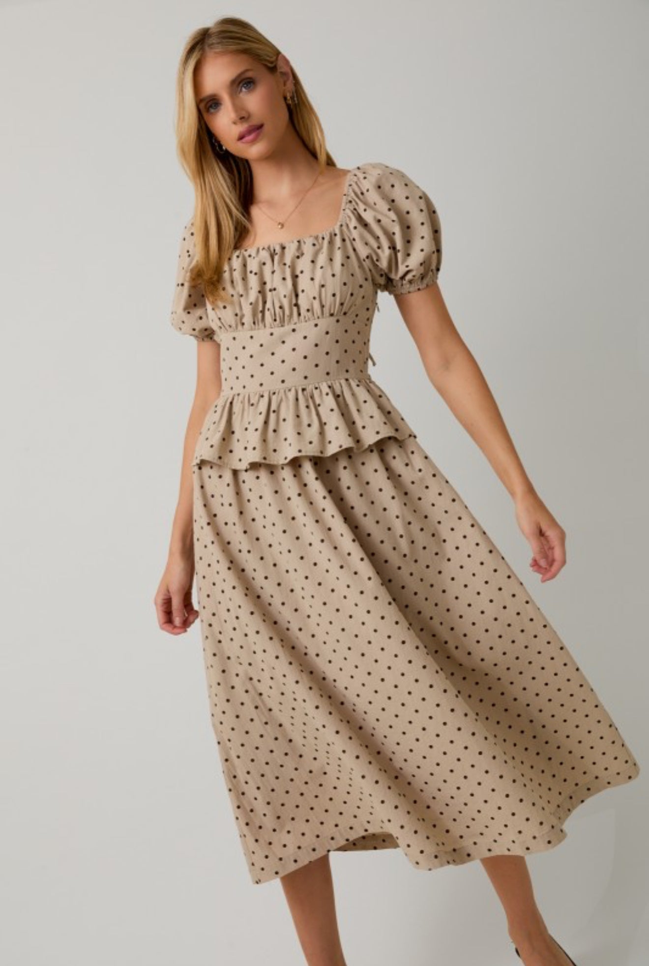 Ruffle at waist, tie at back of neck, midi length, 100% cotton, not lined , tan with brown polka dots